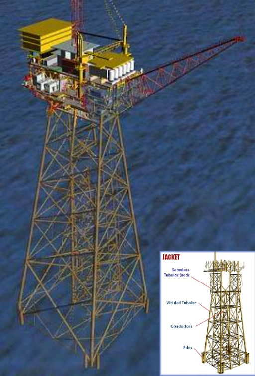 導(dǎo)管架平臺基礎(chǔ)剛性固定于海底??芍С指墒骄凇@碚撟鳂I(yè)水深0米—300米。導(dǎo)管架平臺,多為井口平臺或綜合處理平臺。部分綜合處理平臺均配備模塊鉆機,可為油氣田提供鉆修井服務(wù)。