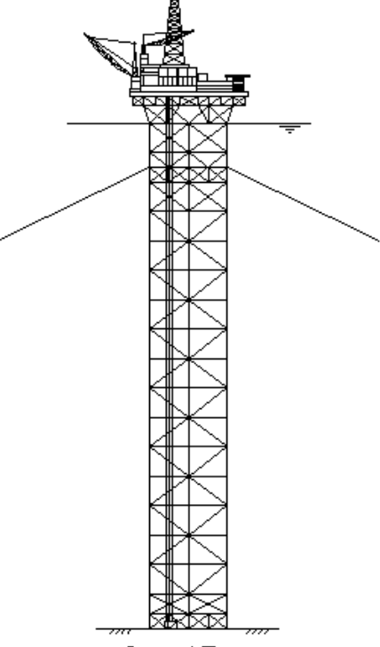 將預(yù)制的鋼塔安放在海底基礎(chǔ)塊上,用鋼索沿不同方向錨定拉緊而成。