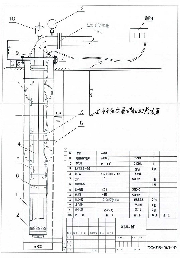 海水提升泵又叫海水潛水泵、耐海水電泵,QHB的意思很好理解是潛海水泵的意思。海水提升泵結構為機泵通過聯(lián)軸器連結,上部是多級泵泵頭,下部為三相異步潛水電機。電機密封為機械密封,電機內部充水潤滑。在很多時候,由于海水水域廣闊,水流緩慢,電機運行產生的熱量無法及時散發(fā)。那么就需要在電機外部加裝一個導流罩(散熱器),導流罩的作用是形成模擬井筒裝置后,水流沖刷電機表面,及時有效的帶走多余熱量,保護電機。